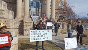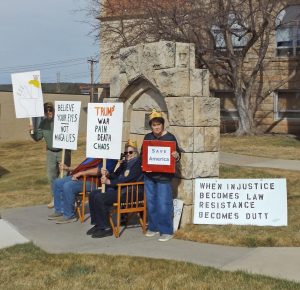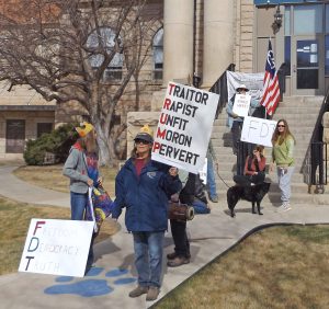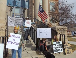 Posted 18 Feb 2025: Weston County Democrats joined others across the state and the nation on Presidents Day 2025 to protest actions of President Trump and his Administration. Photograph taken on the steps of the Weston County Courthouse.